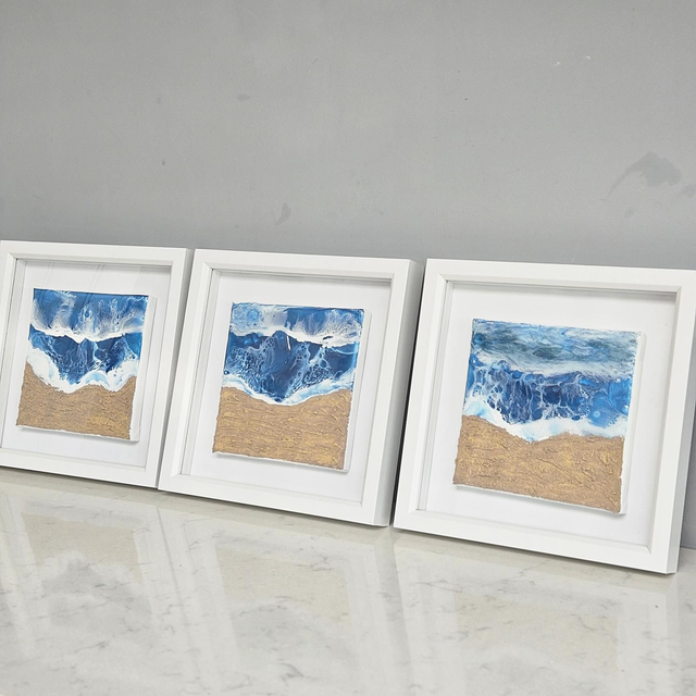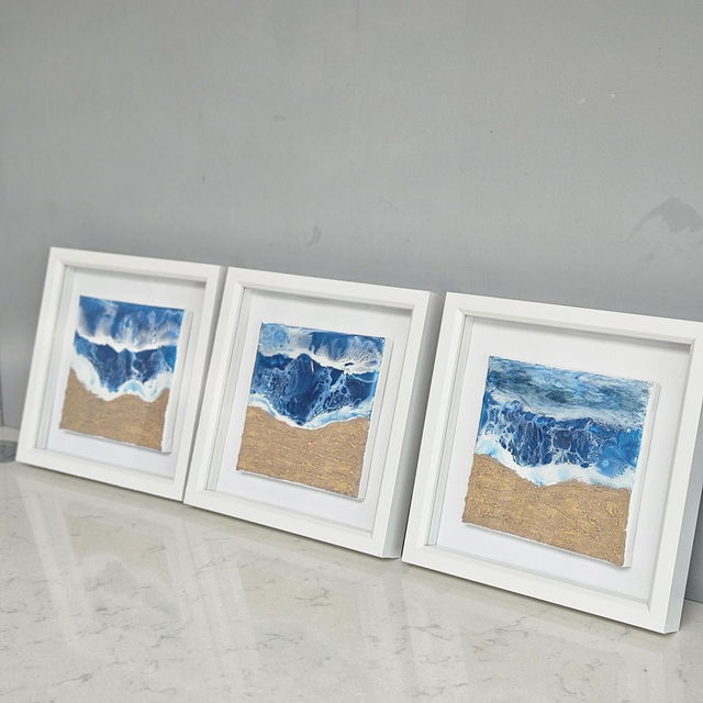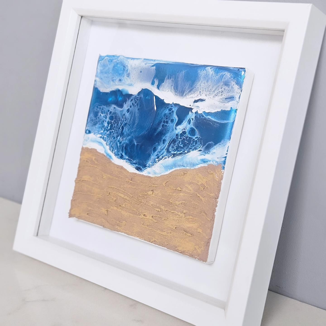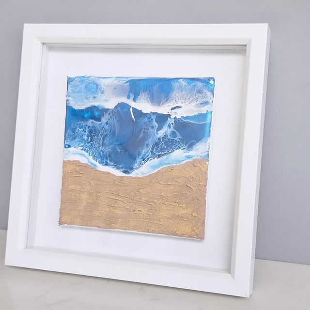 Transform your living space with this handcrafted mini beach resin artwork on canvas. Each piece is not only a stunning decoration, but also a unique work of art. Add a touch of the beach to your home with this beautiful piece, framed in a white frame or deep box. Dimensions are 20x20cm and the weight is between 700gms to 1kg , making it easy to hang and display. Don't miss out on this one-of-a-kind decor piece for your home!