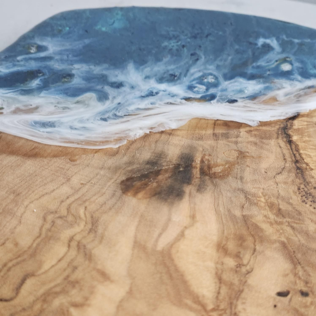 Elevate your next party with our handmade olive wood charcuterie board featuring a stunning sea wave resin design. This unique piece doubles as a chopping board and decorative ornament, perfect for serving your favorite foods in style. Each board is carefully crafted to showcase its natural wood grain and one-of-a-kind resin waves. Ideal for housewarming gifts or as a statement piece in your own homeware collection. Add a touch of elegance and functionality to any gathering with this versatile accessory that will surely impress your guests. Shop now for a truly exceptional addition to your kitchen.