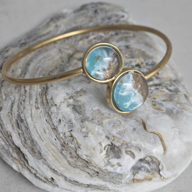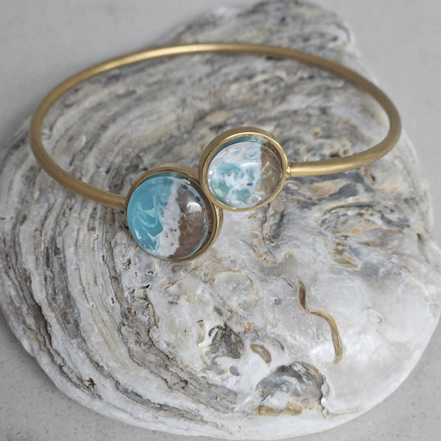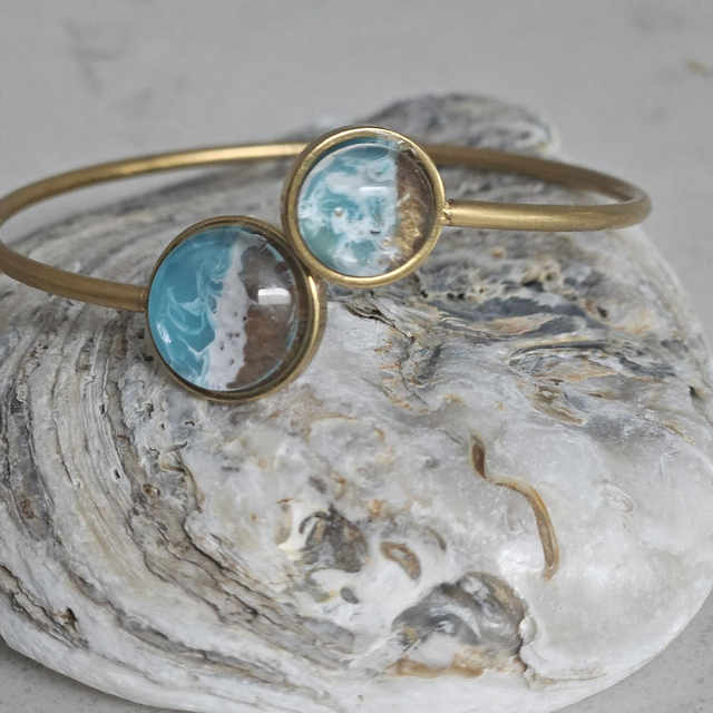 Celebrate meaningful moments with this Ocean-Inspired Bracelet Open Cuff Design, One Size, designed to capture the beauty of the sea in a timeless, wearable form. Features handcrafted resin accents that mimic rolling ocean waves meeting sandy shores—no two pieces are ever the same, making every set as unique as the person receiving it. The warm gold-tone cuff design offers an elegant yet relaxed coastal feel, perfect for everyday wear or special occasions. Whether you’re gifting for a birthday, anniversary, holiday, or a thoughtful surprise for an ocean lover, this bracelet set delivers beauty, symbolism, and sentiment in one unforgettable gift. Beautifully balanced between modern elegance and coastal charm, this set is ideal for anyone who feels at home by the sea.