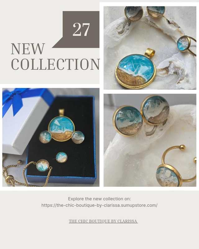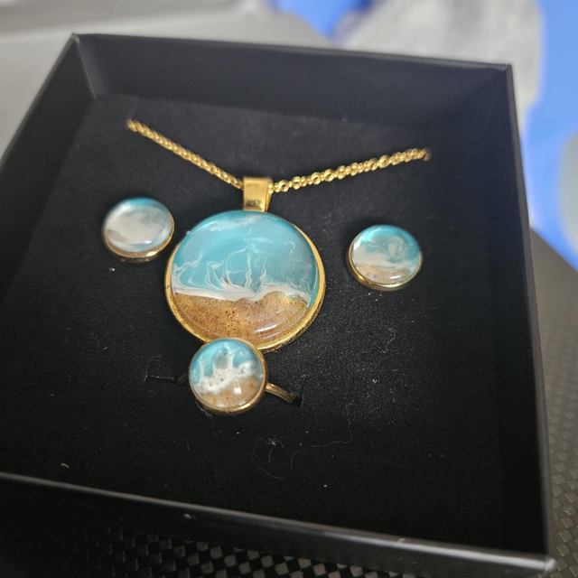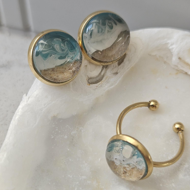 Bring the serenity of the shoreline wherever you go with this Ocean-Inspired Jewelry Set, handcrafted to capture the beauty of seafoam waves meeting golden sand. Each piece features a unique, swirling blue-and-white ocean design layered over real sand tones, creating a miniature seascape that’s truly one of a kind.