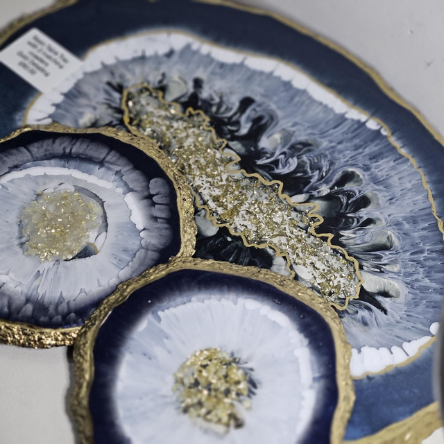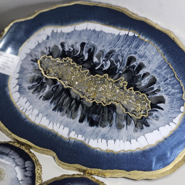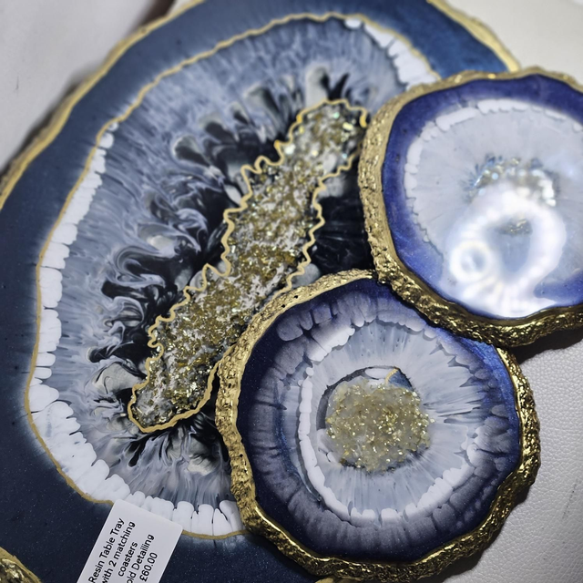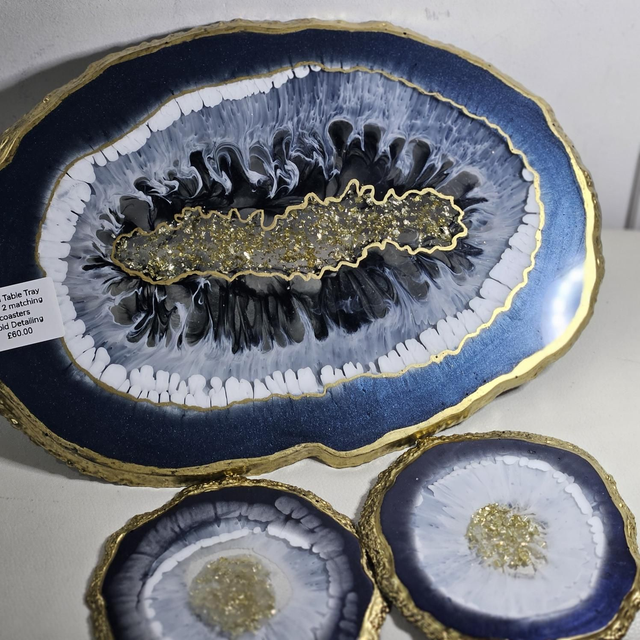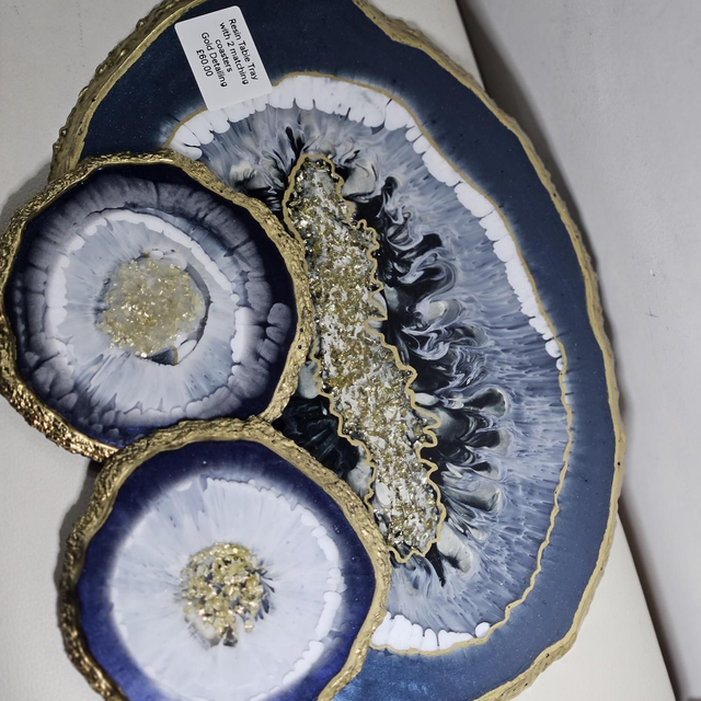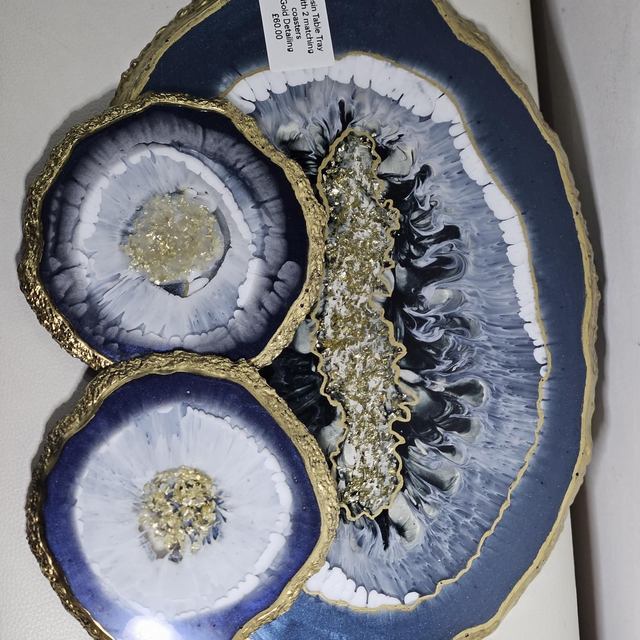 Resin Tray with 2 set of Coasters. Gold detailing.